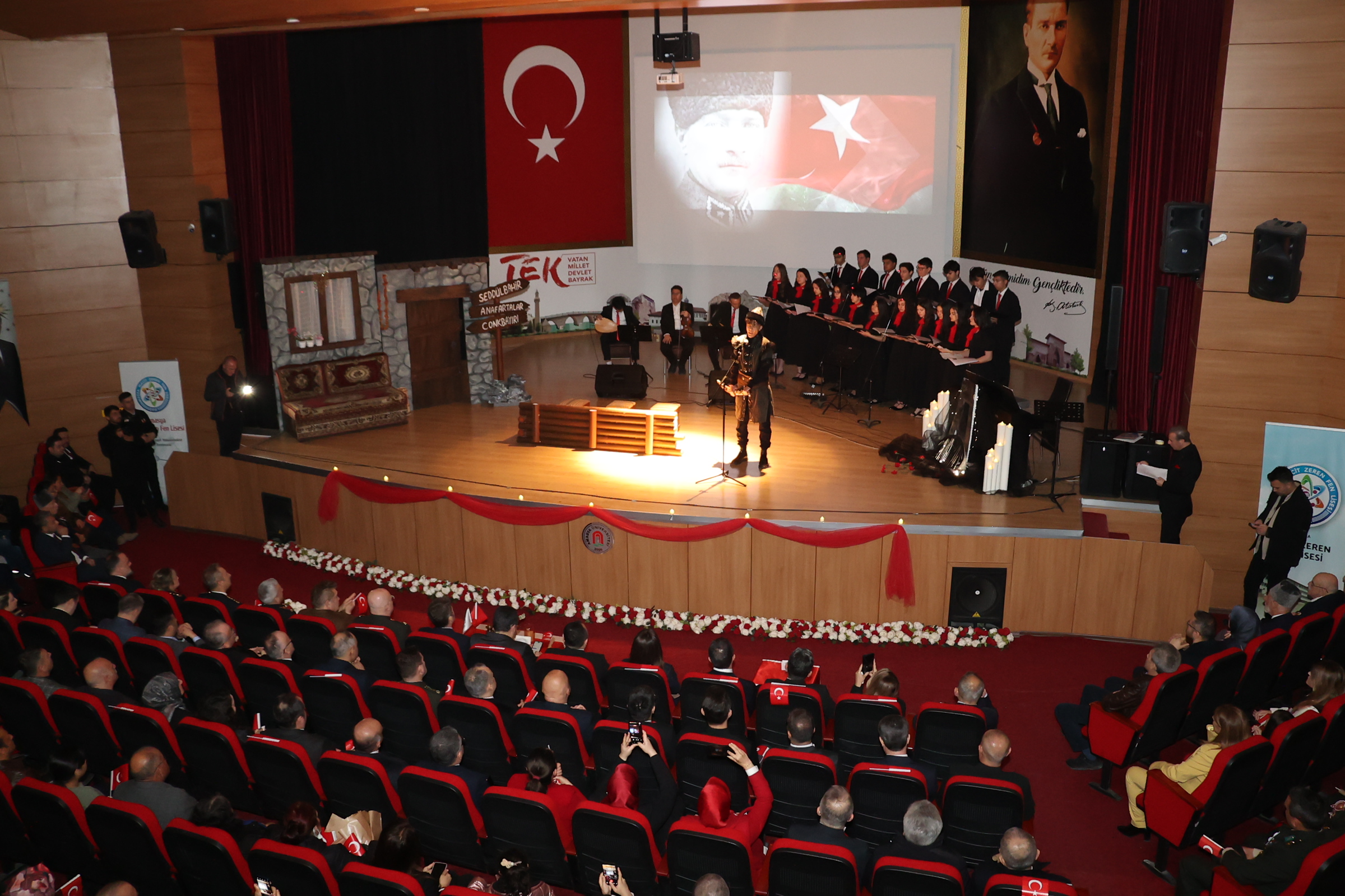 Amasya Üniversitesi Milli Hakimiyet Yerleşkesi Kongre ve Kültür Merkezi’nde, Amasya Macit Zeren Fen Lisesi tarafından 18 Mart Çanakkale Zaferi’nin 111. yıl dönümü ve Şehitleri Anma Günü kapsamında bir anma programı düzenlendi.