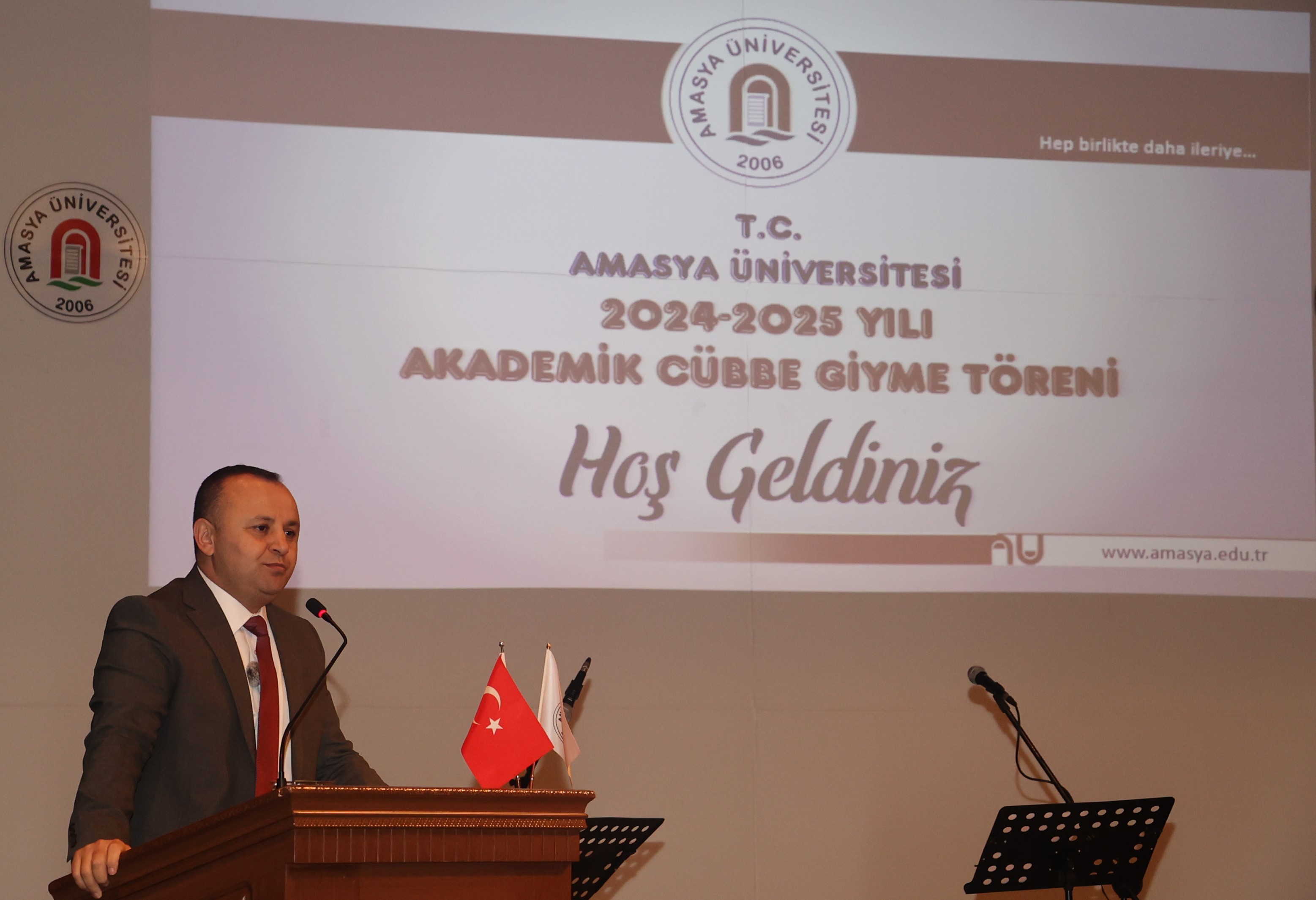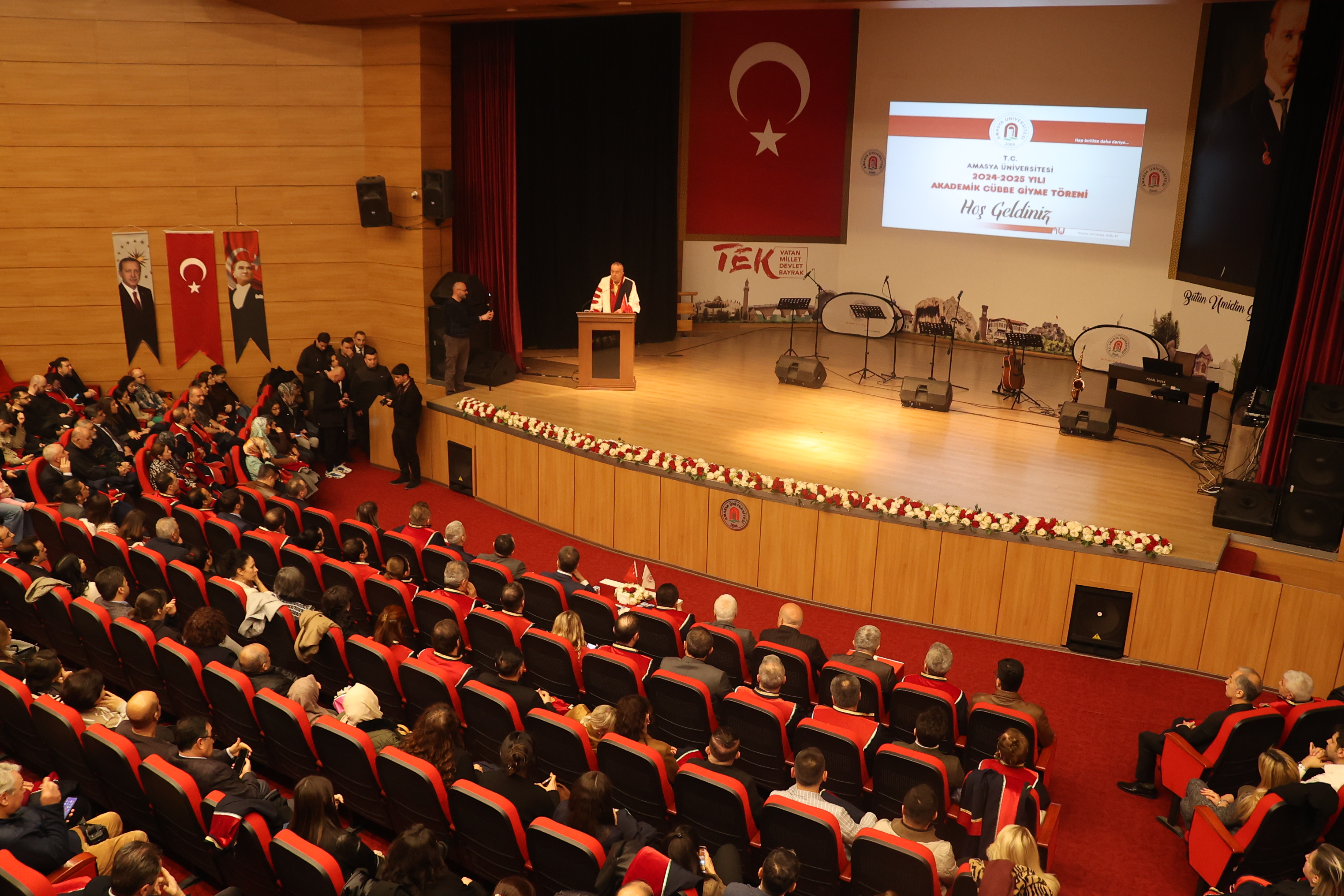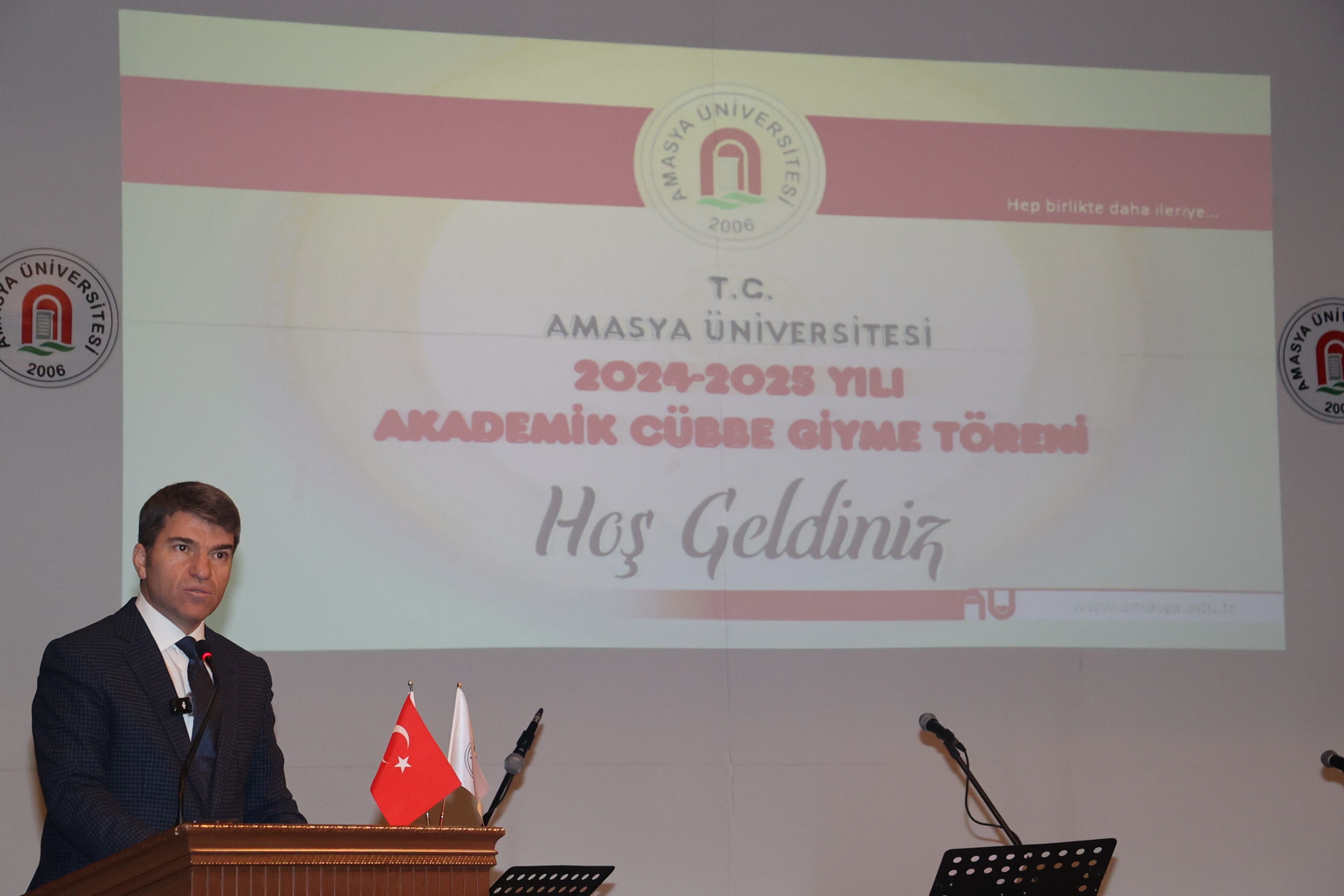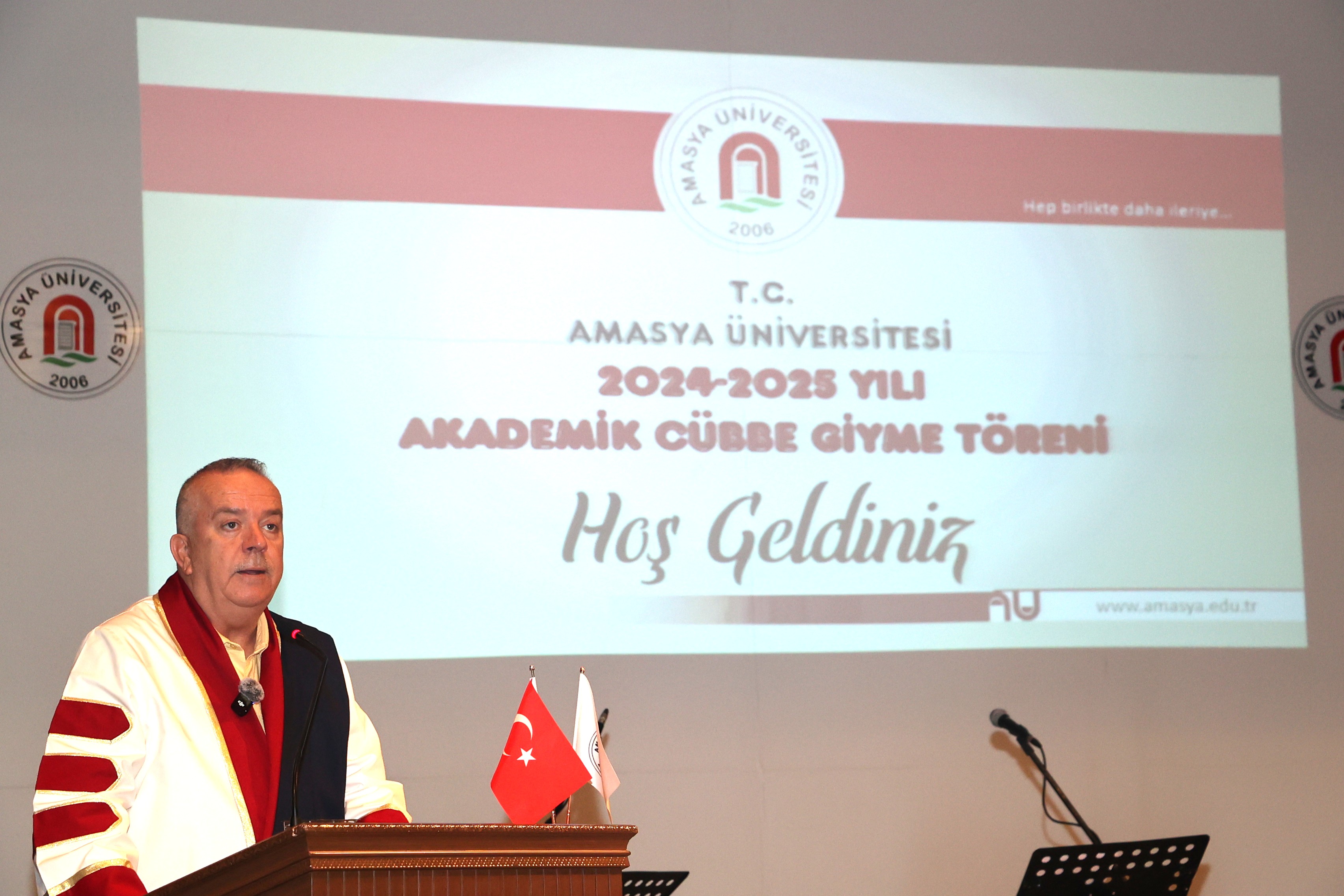 Törenin açılış konuşmasını yapan Amasya Üniversitesi Rektörü Prof. Dr. Ahmet Hakkı Turabi, 24 Kasım 2024 tarihinden itibaren akademik yükselme sağlayan ve ilk ataması yapılan 17 profesör, 27 doçent ve 89 doktor öğretim üyesi olmak üzere toplam 133 akademik personelin cübbe giydiğini ifade etti. Ayrıca bilimsel çalışmaları, akademik üretkenlikleri ve üniversitenin kurumsal gelişimine sundukları katkılar dolayısıyla 10 akademisyenin ödüllendirildiğini belirtti. Rektör Turabi, Amasya Üniversitesi’nin eğitim-öğretim, araştırma-geliştirme, toplumsal katkı ve uluslararasılaşma alanlarında belirlediği stratejik hedefler doğrultusunda istikrarlı bir gelişim gösterdiğini vurguladı. Yükseköğretim Kurulu tarafından tahsis edilen akademik kadroların üniversitenin insan kaynağını güçlendirdiğini ifade eden Turabi, YÖK Başkanı Prof. Dr. Erol Özvar’a desteklerinden dolayı teşekkür etti.