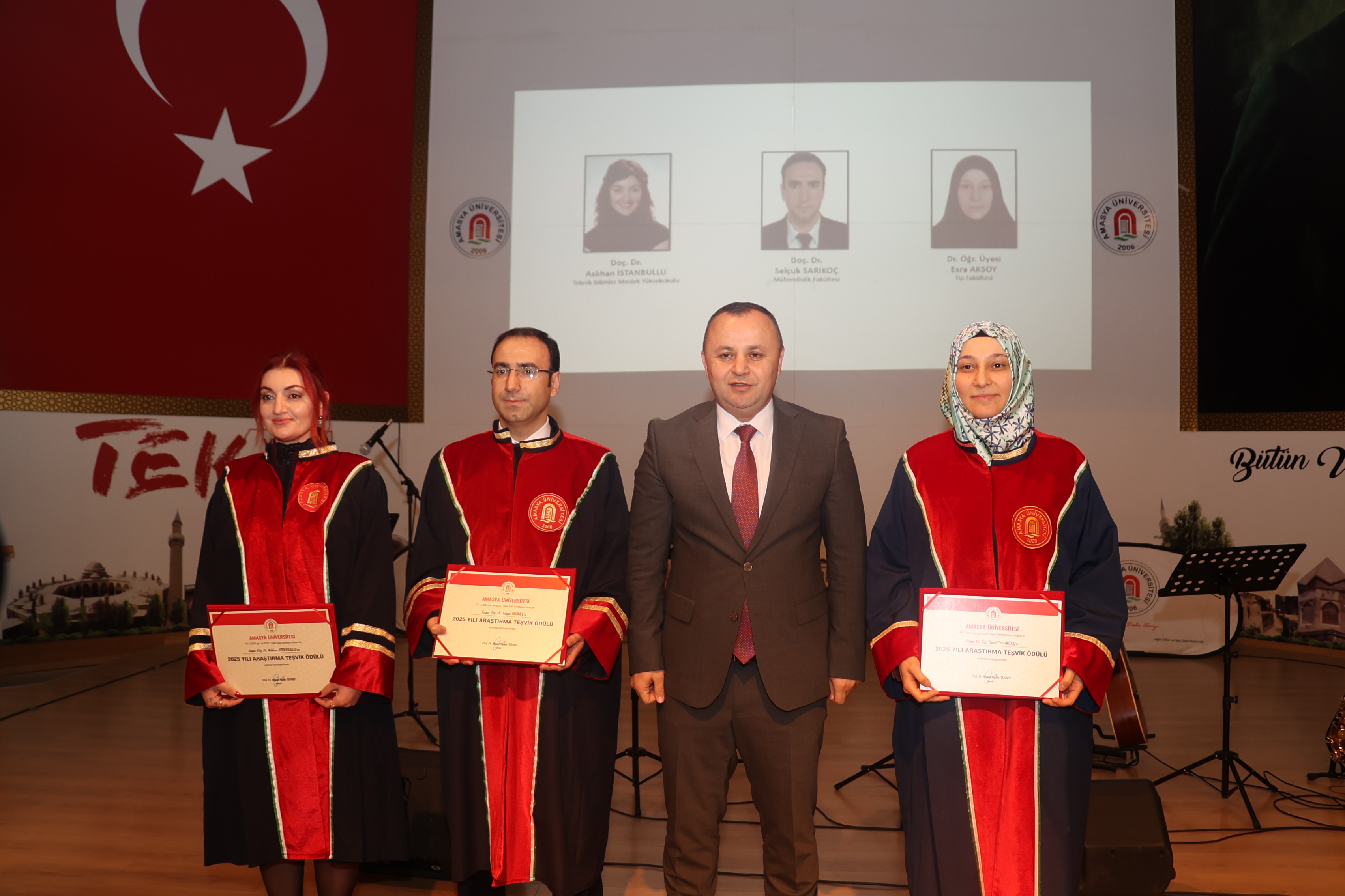“Araştırma Teşvik Ödülü” almaya hak kazanan; Amasya Teknik Bilimler Meslek Yüksekokulu Öğretim Üyesi Doç. Dr. Aslıhan İstanbullu, Mühendislik Fakültesi Öğretim Üyesi Doç. Dr. Selçuk Sarıkoç ve Tıp Fakültesi Öğretim Üyesi Dr. Öğr. Üyesi Esra Aksoy’a ödülleri Amasya Belediye Başkanı Av. Turgay Sevindi tarafından takdim edildi.