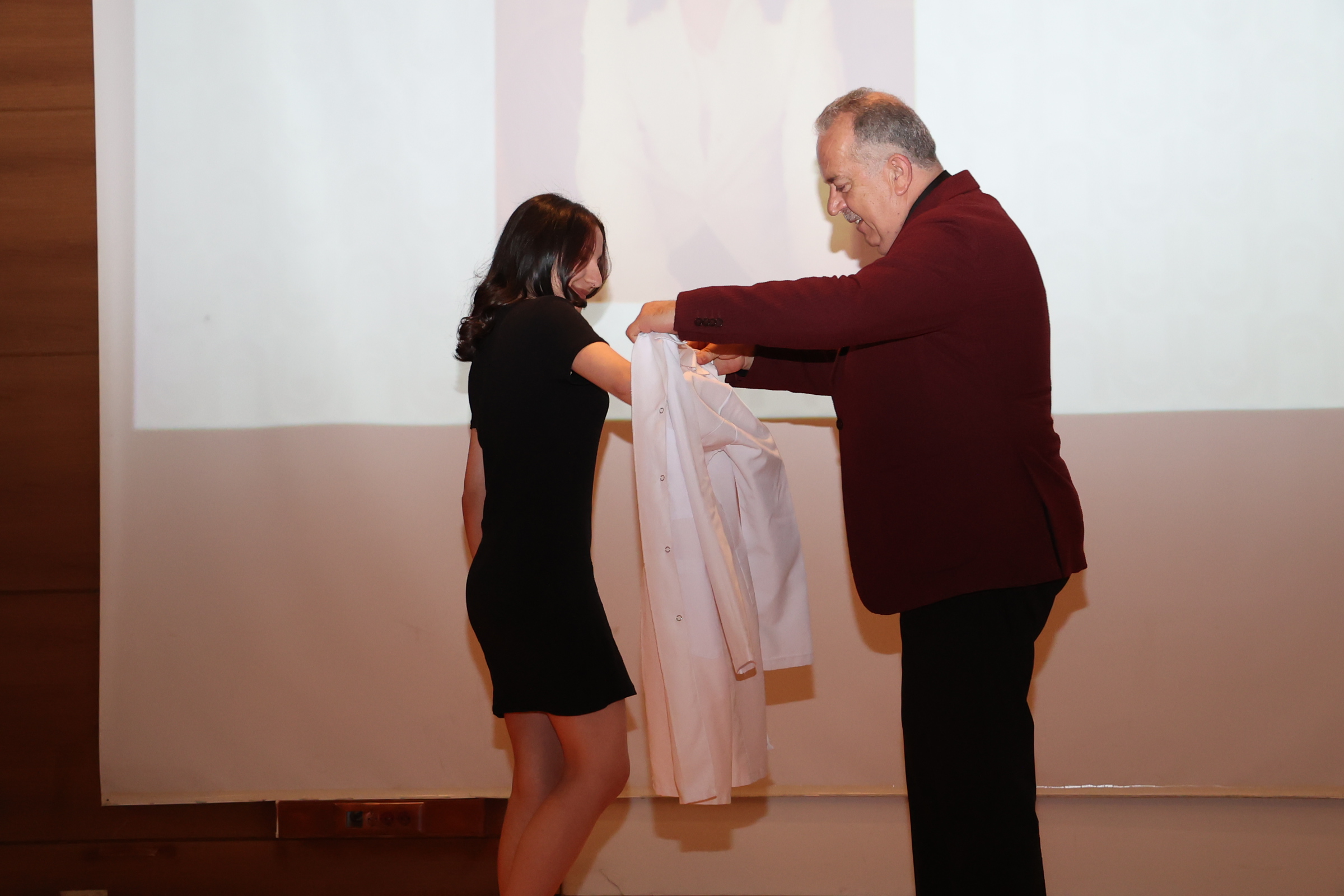 Programın devamında, Beslenme ve Diyetetik Bölümü 3. sınıf ile Fizik Tedavi ve Rehabilitasyon Bölümü 1. sınıf öğrencileri sahneye davet edilerek beyaz önlükleri hazirun tarafından giydirildi.