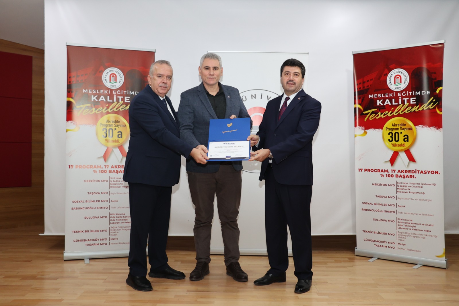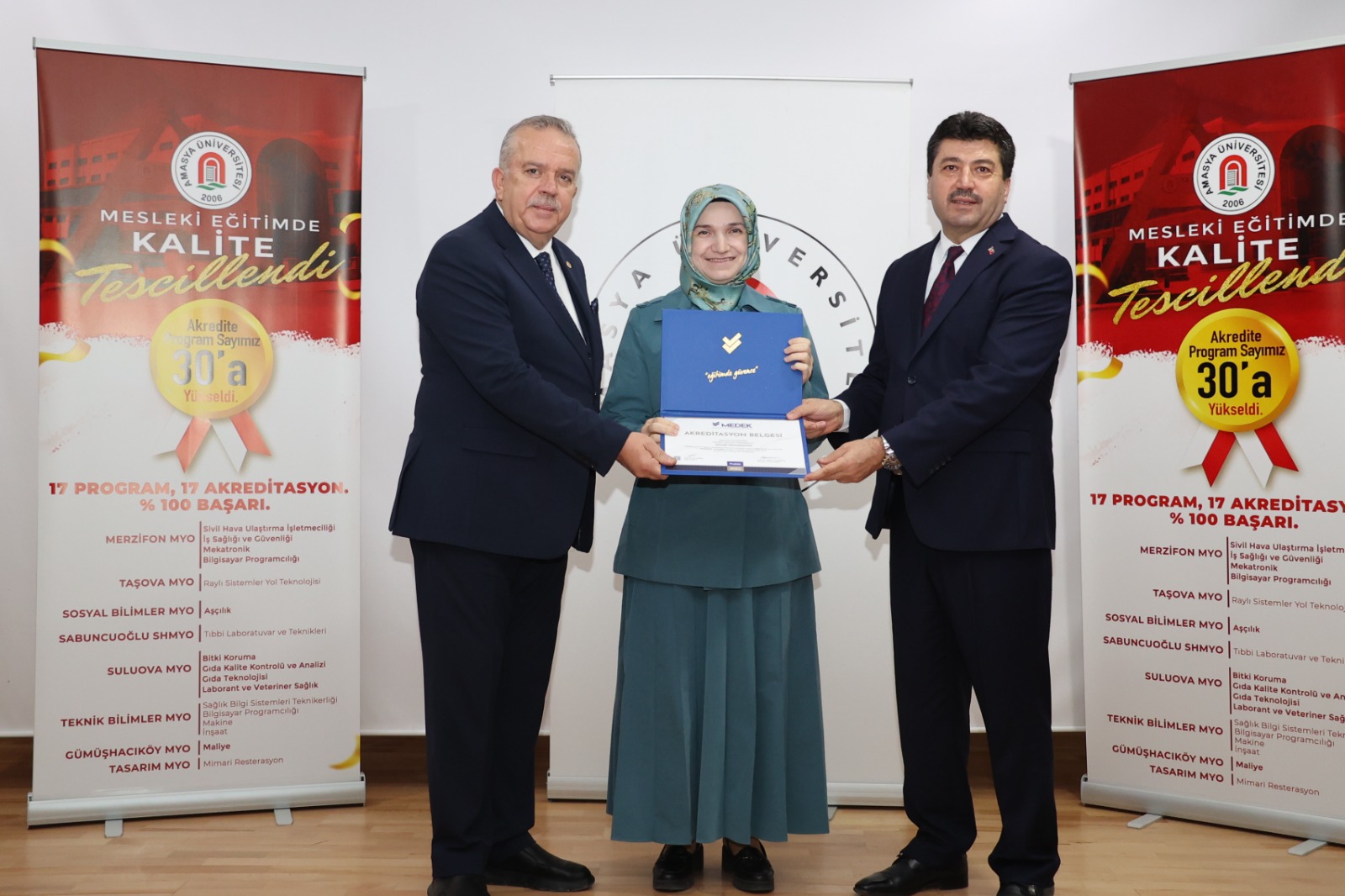 Mesleki Eğitim Değerlendirme ve Akreditasyon Derneği (MEDEK) tarafından Amasya Üniversitesi’ne bağlı yüksekokullarda akredite edilen 17 programın akreditasyon belgeleri, “Kaliteyle Güçlenen Üniversite: Akreditasyon ve Sürekli İyileştirme Zirvesi” kapsamında düzenlenen törenle takdim edildi.