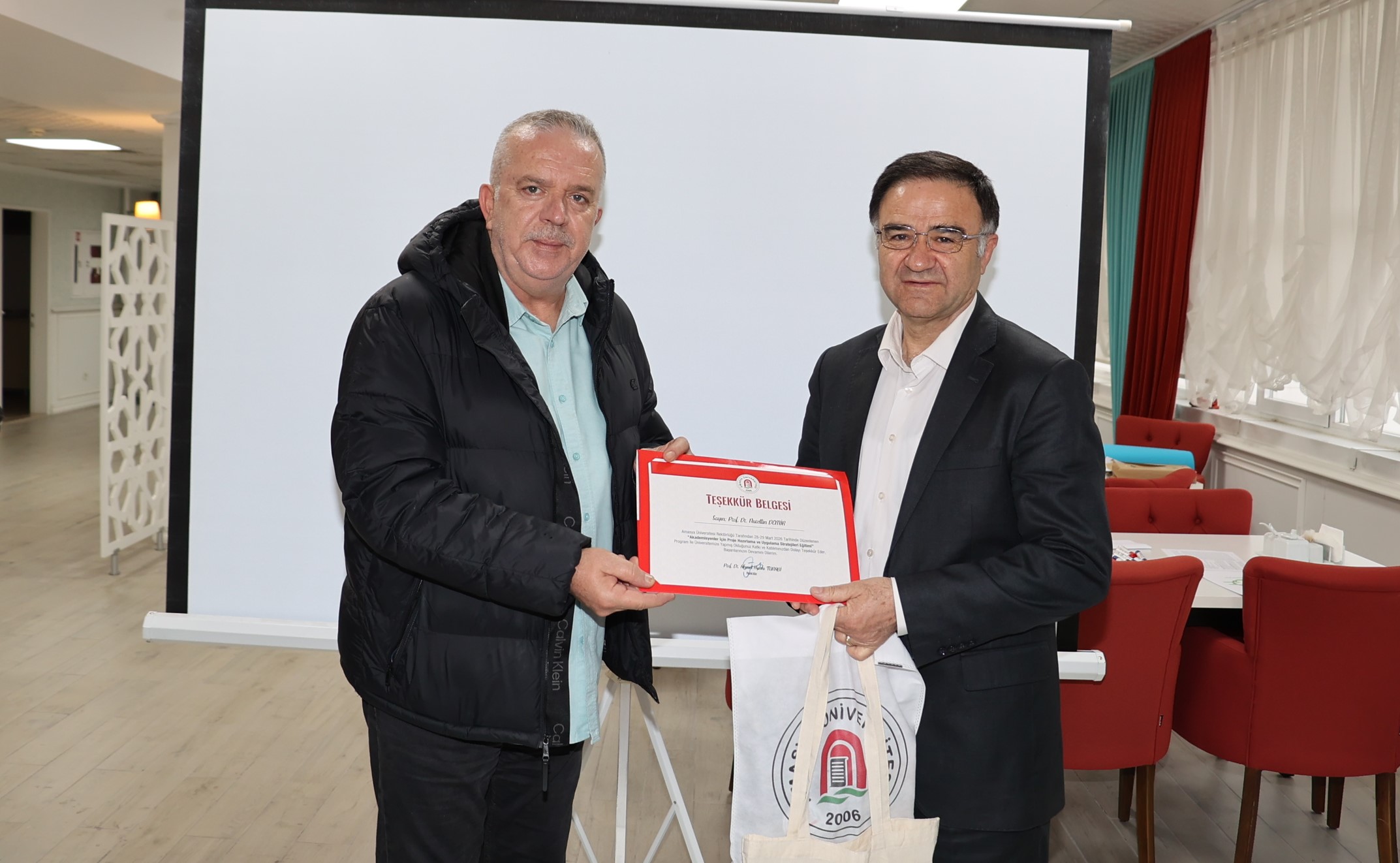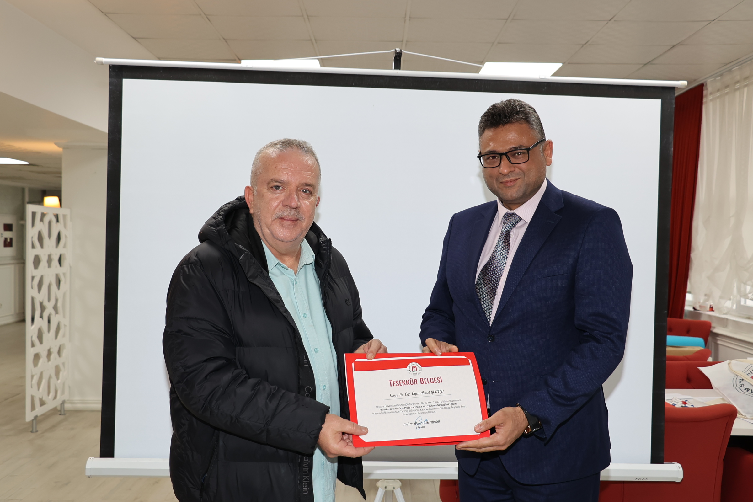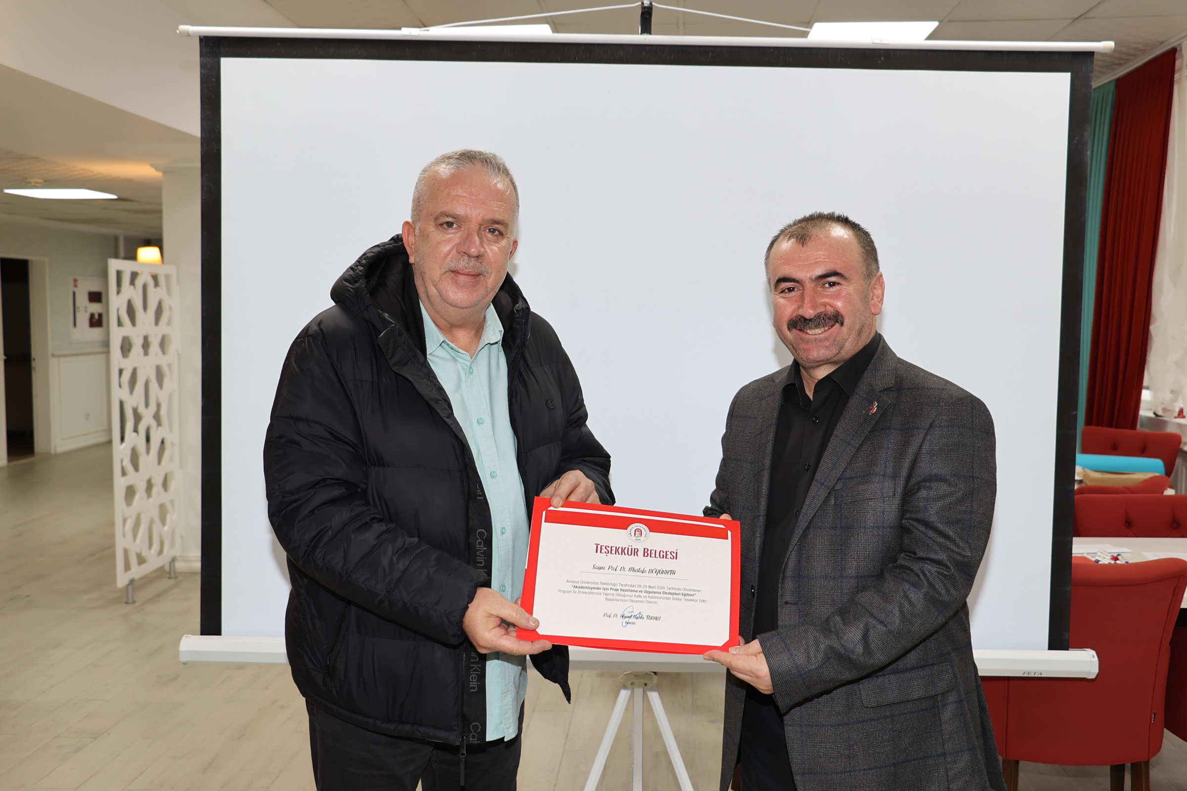 Eğitim programı başarıyla tamamlanırken, teşekkür ve katılım belgeleri Amasya Üniversitesi Rektörü Prof. Dr. Ahmet Hakkı Turabi tarafından takdim edildi.
