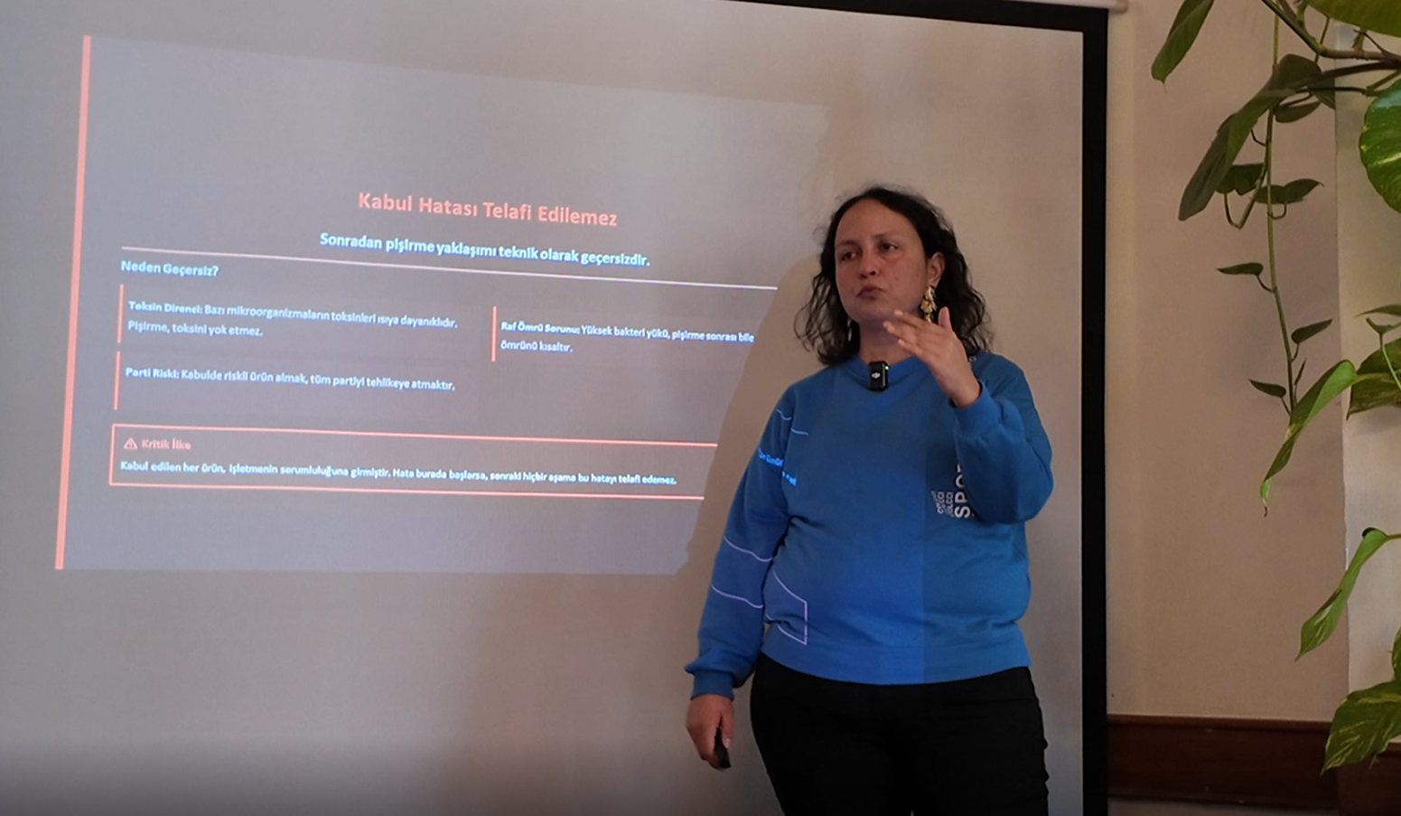 Etkinlikte, gıda güvenliğine ilişkin yaygın ve yerleşik algılar bilimsel ve teknik bir bakış açısıyla ele alındı. Eğitim süresince, gıda güvenliğinin yalnızca mutfak hijyeniyle sınırlı olmadığı; hammadde kabulü, depolama koşulları, sıcaklık kontrolü ve kayıt tutma süreçlerinin güvenli gıda üretiminde belirleyici rol oynadığı vurgulandı. “Gıda güvenliği mutfakta değil, kabul ve depolamada başlar” yaklaşımı, bilimsel temellere dayandırılarak katılımcılarla paylaşıldı.