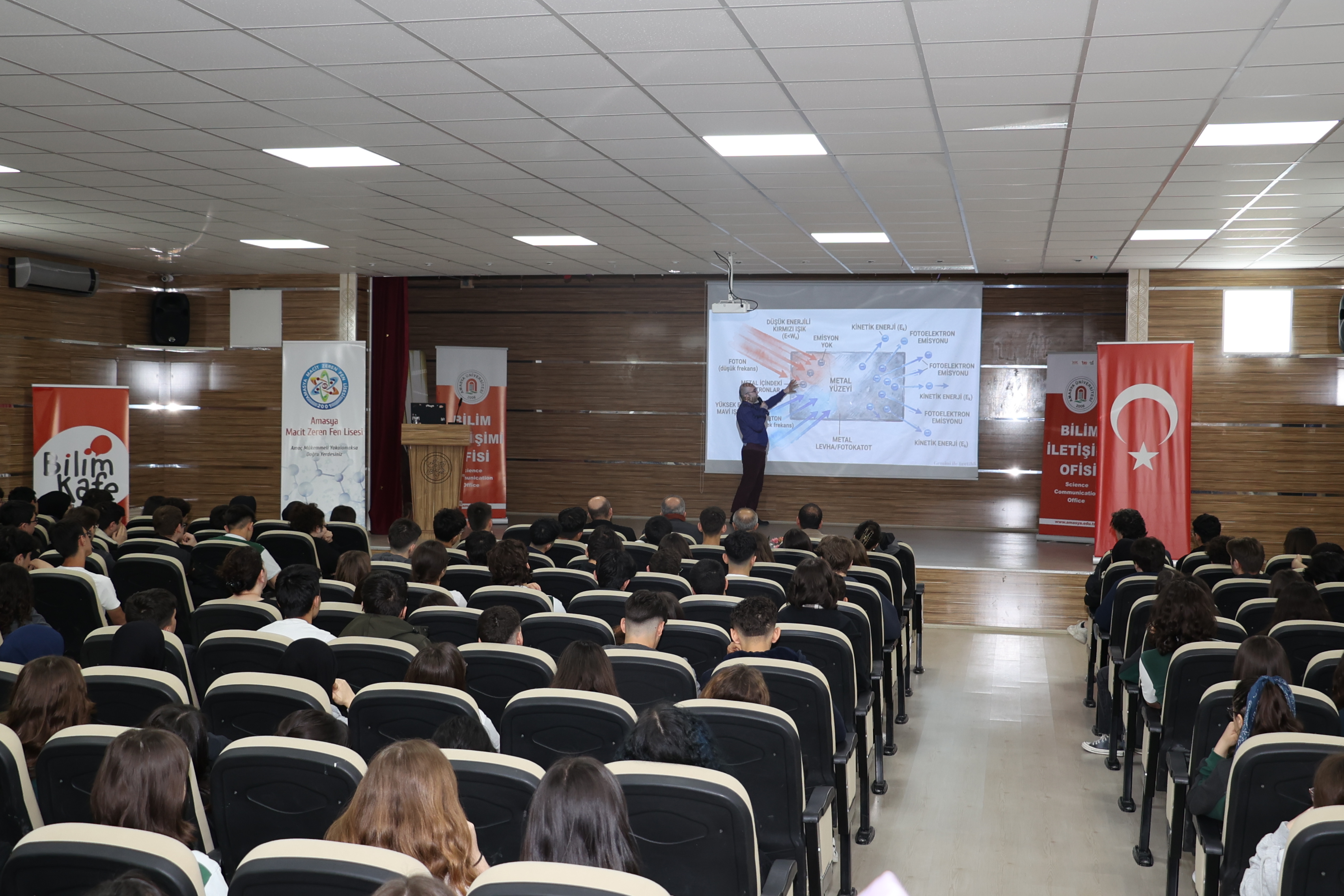 Etkinliğe Amasya Üniversitesi Rektörü Prof. Dr. Ahmet Hakkı Turabi, Mühendislik Fakültesi Dekanı Prof. Dr. Levent Uğur ve Macit Zeren Fen Lisesi Müdürü Abdullah Onur katıldı. Mühendislik Fakültesi öğretim üyelerinden Doç. Dr. Furkan Semih Dündar ise “Kuantum Fiziği” başlıklı söyleşiyle öğretmen ve öğrencilerle bir araya geldi.