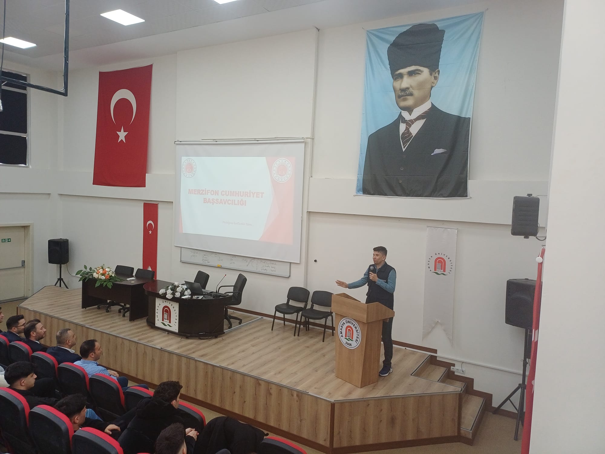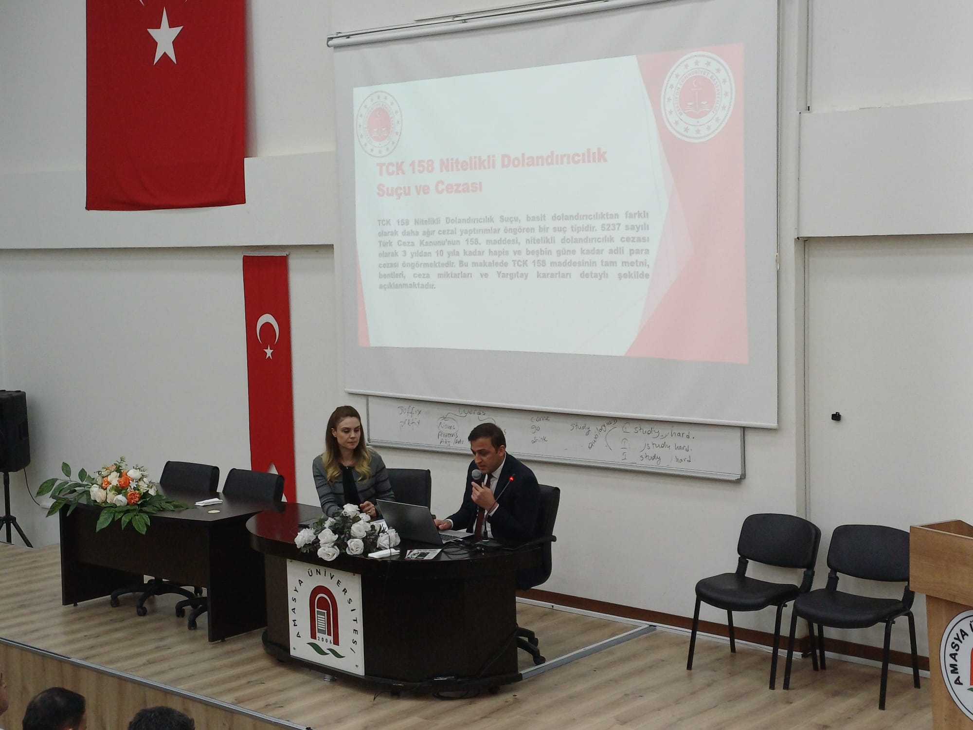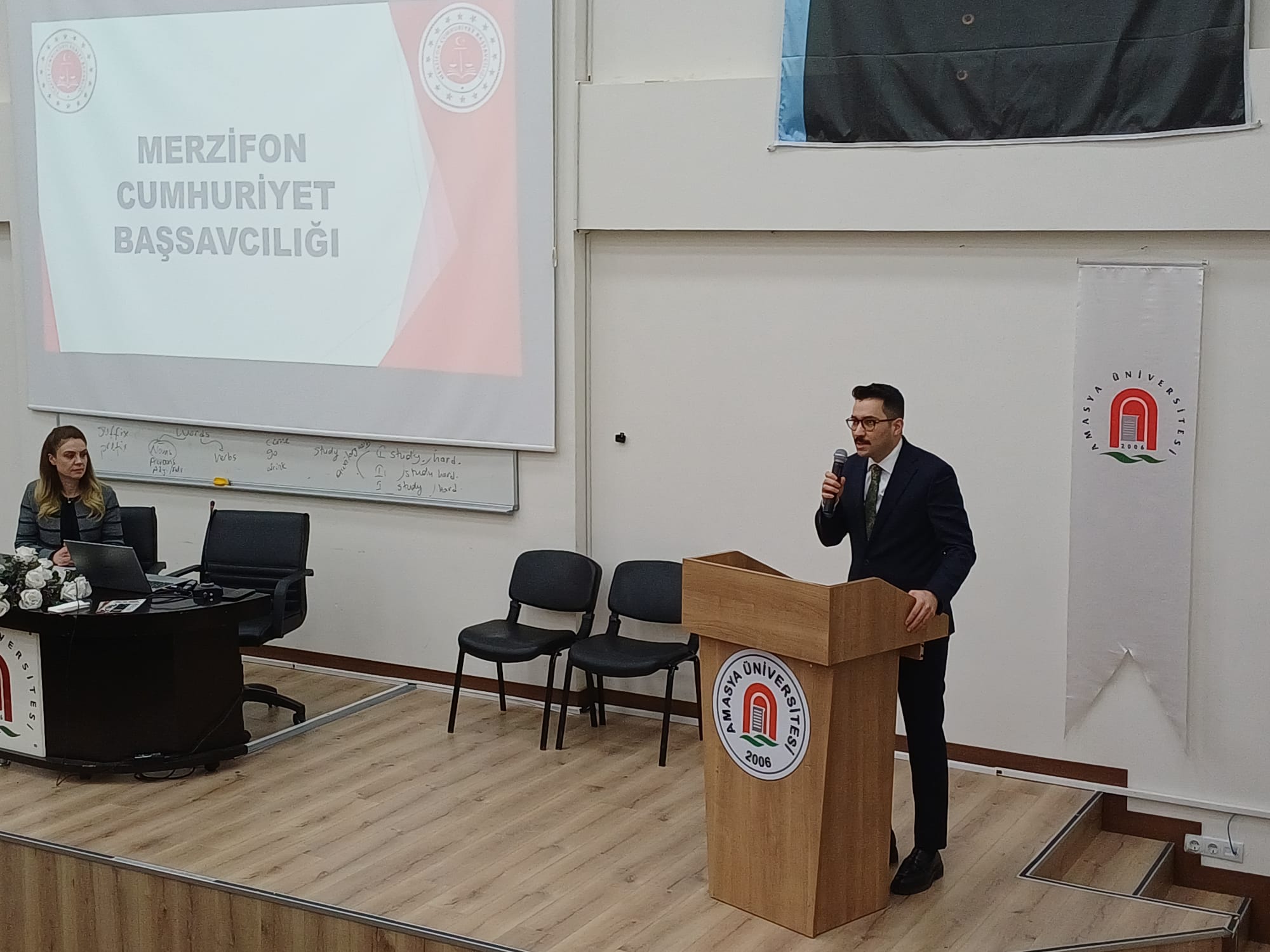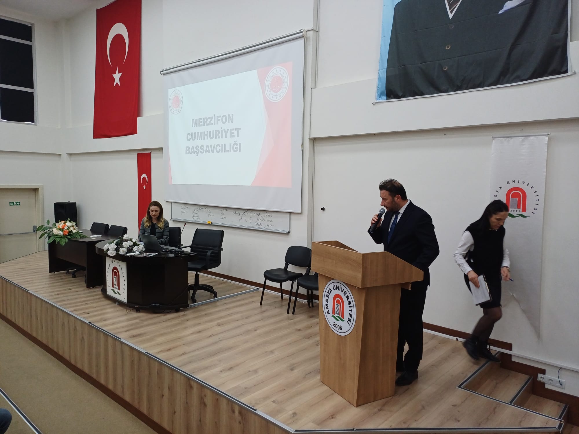 Merzifon Cumhuriyet Başsavcılığı koordinasyonunda, Amasya İl Emniyet Müdürlüğü’nün katkıları ve Amasya Üniversitesi Merzifon Meslek Yüksekokulu’nun iş birliğiyle “Üniversite Gençliği ve IBAN Kiralama: Hukuki ve Cezai Boyut” temalı farkındalık etkinliği gerçekleştirildi.