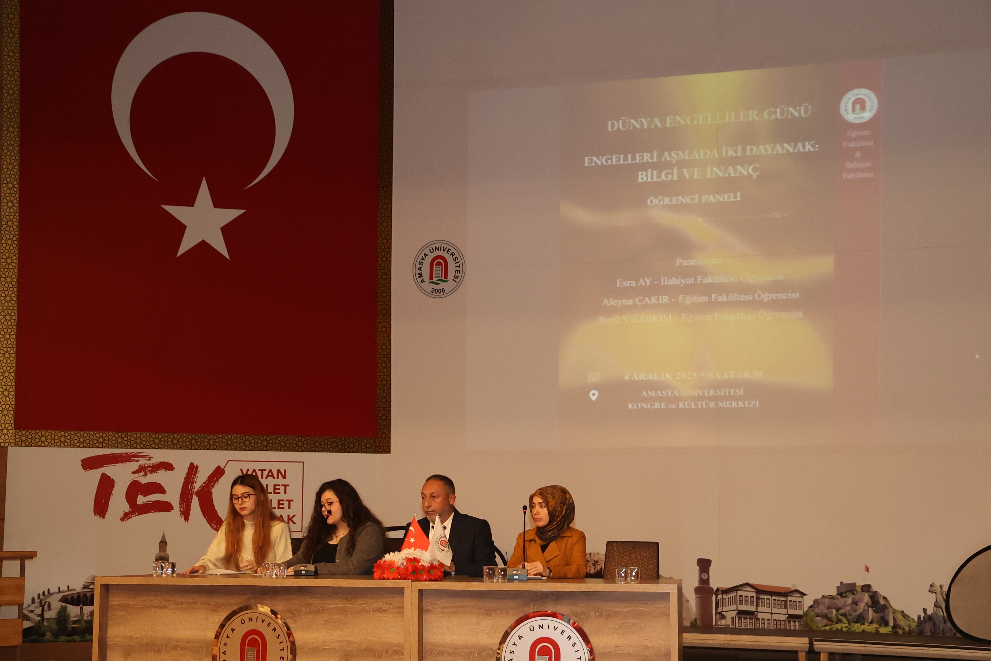 Amasya Üniversitesi Eğitim Fakültesi ile İlahiyat Fakültesi tarafından organize edilen 3 Aralık Dünya Engelliler Günü kapsamında “Engelleri Aşmada İki Dayanak: Bilgi ve İnanç” konulu bir panel gerçekleştirildi. Panelin moderatörlüğünü Sevgican Anadolu Engelliler Derneği Başkanı İsmail İlmaz yürüttü.